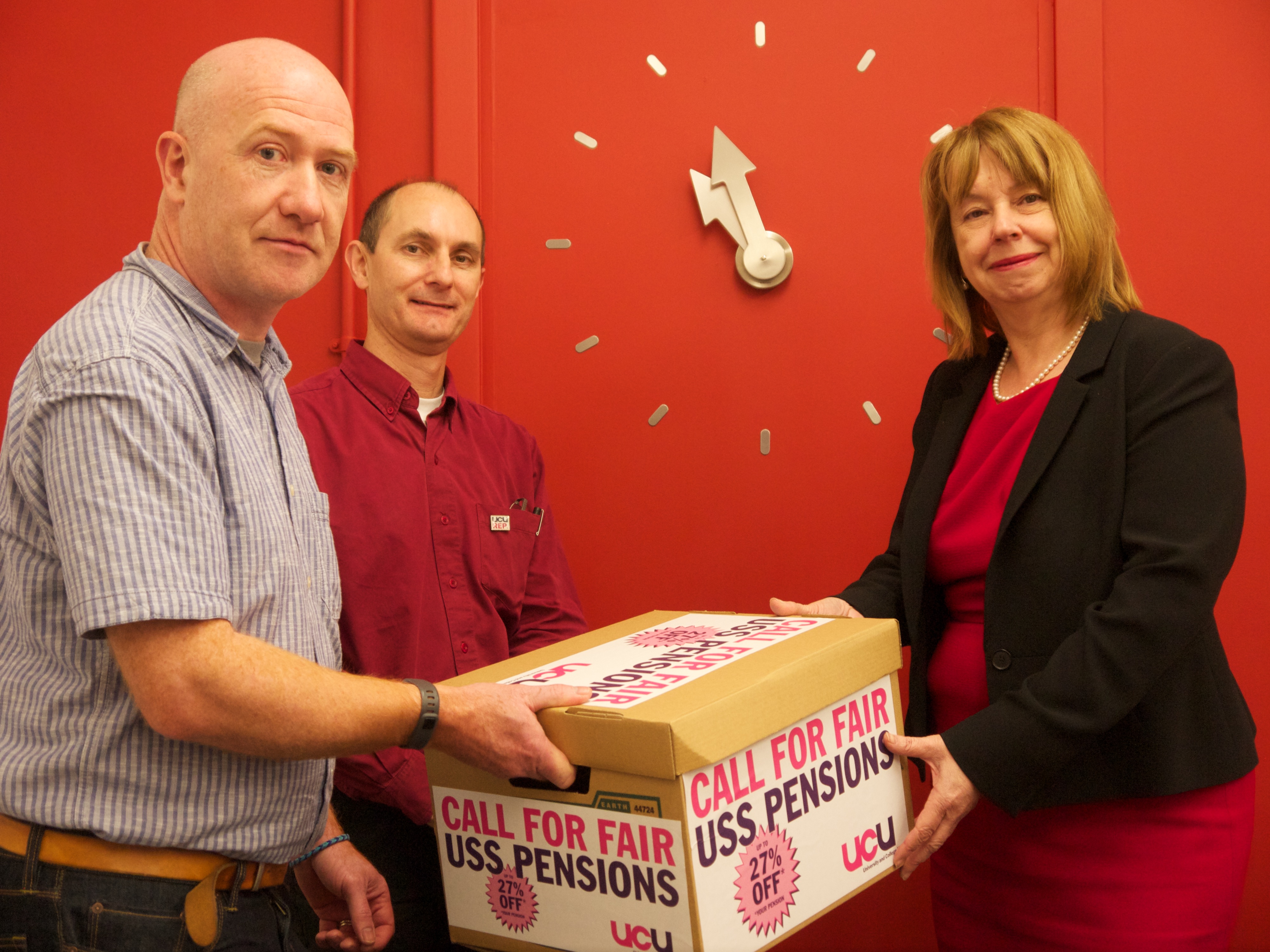 UCU Petition Published 5 December 2014 at 4000 × 3000 in UCU Petition Mark Hale (Cardiff University UCU President), Colin Berry (Cardiff University Executive Committee Member), and Jane Dowden (Cardiff University Chief Operating Officer)